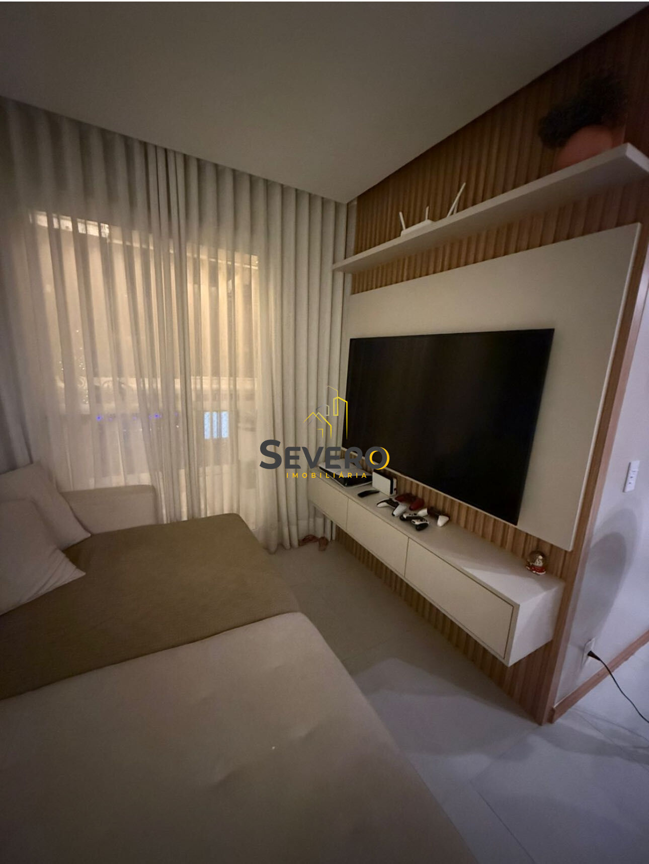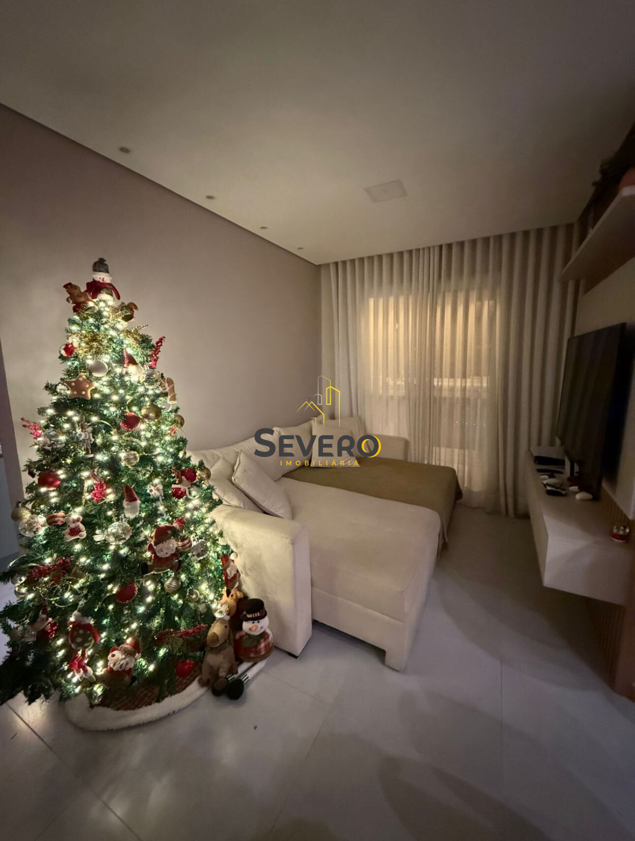 Com cortina na sala, cortina de vidro na varanda e também tela de proteção.
