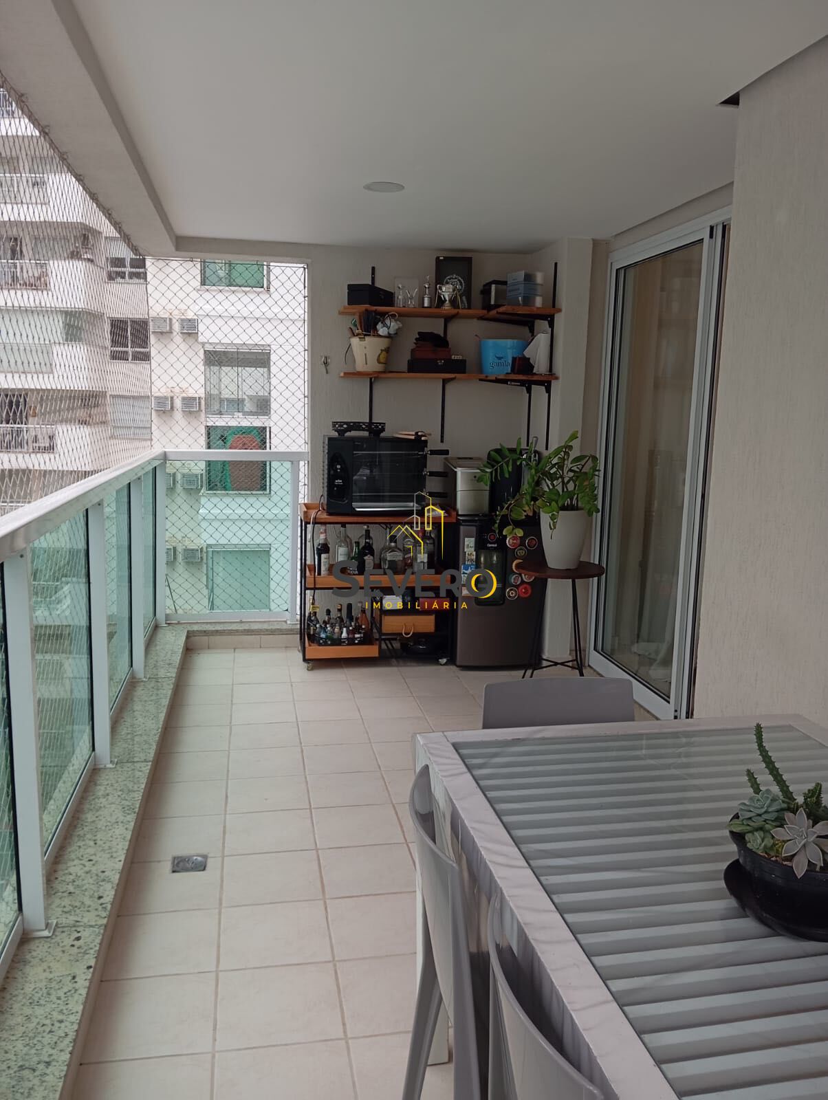 Varanda gourmet com fechamento em cortina de vidro e tela de segurança