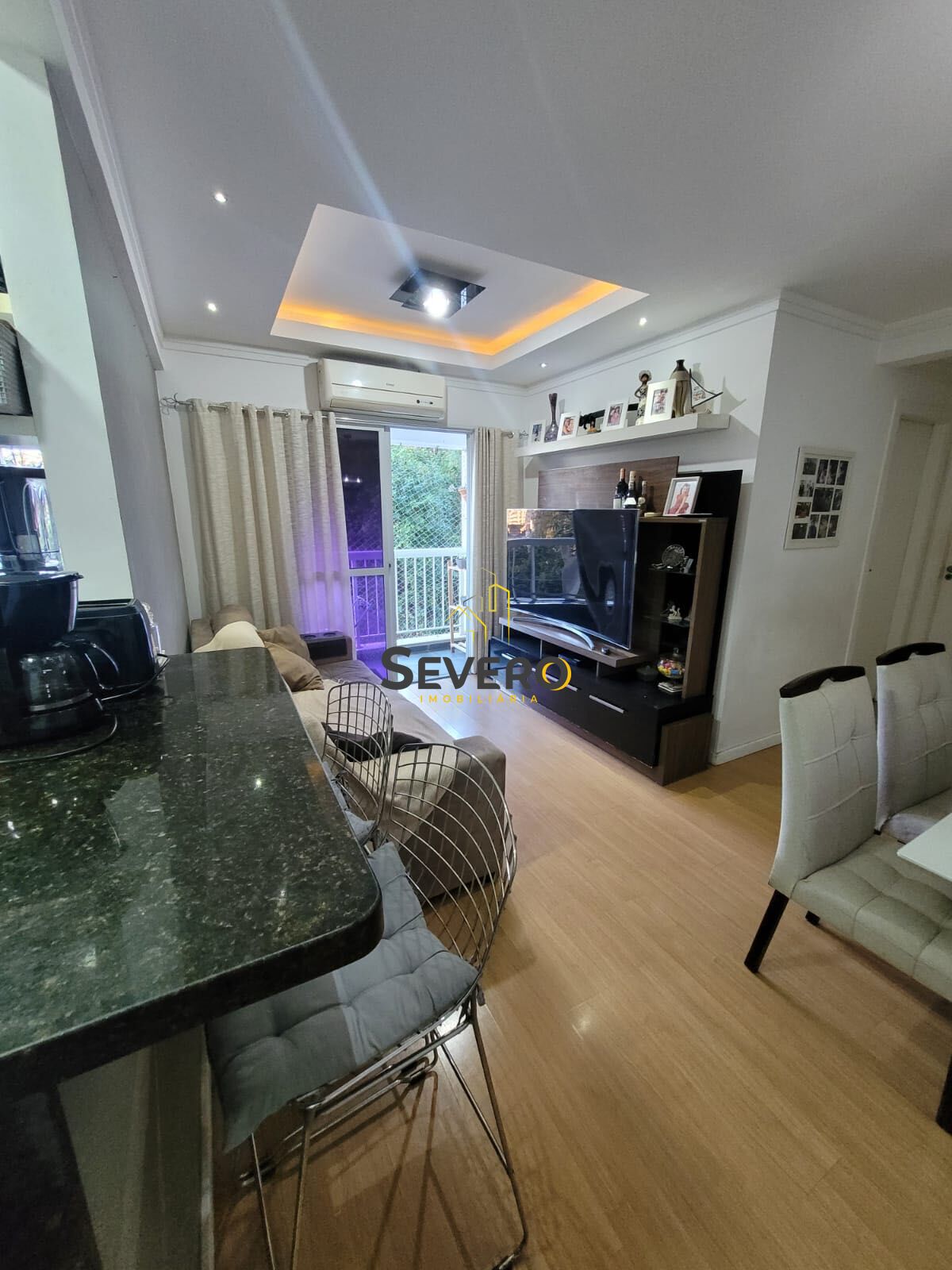 São 2 dormitórios (1 suíte), sala com teto rebaixado e iluminação moderna, varanda com vista para o verde, cozinha americana com eletros embutidos. Piso laminado em todos os ambientes, ar-condicionado instalado e tubulação pronta para split.
