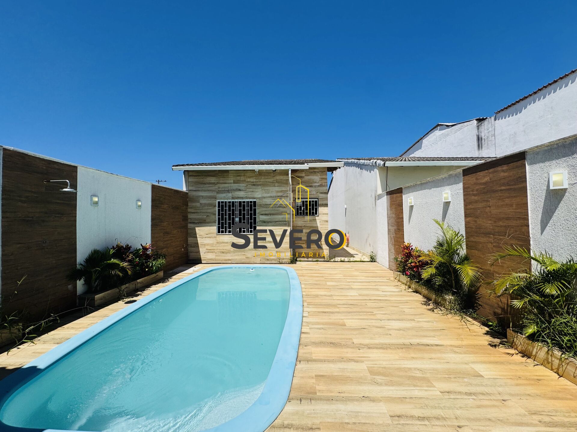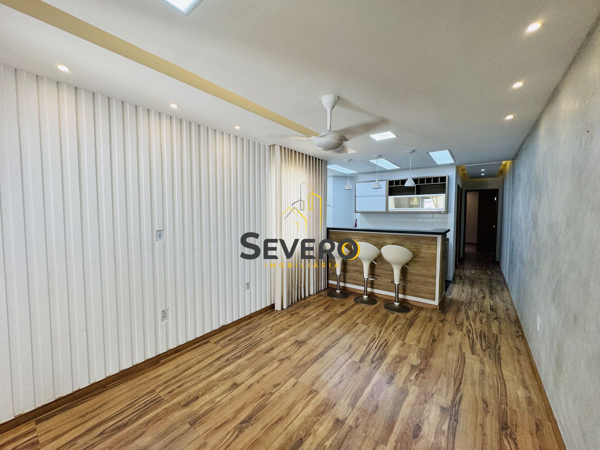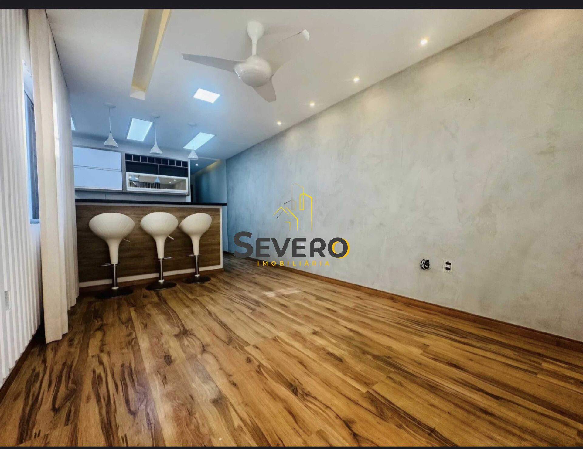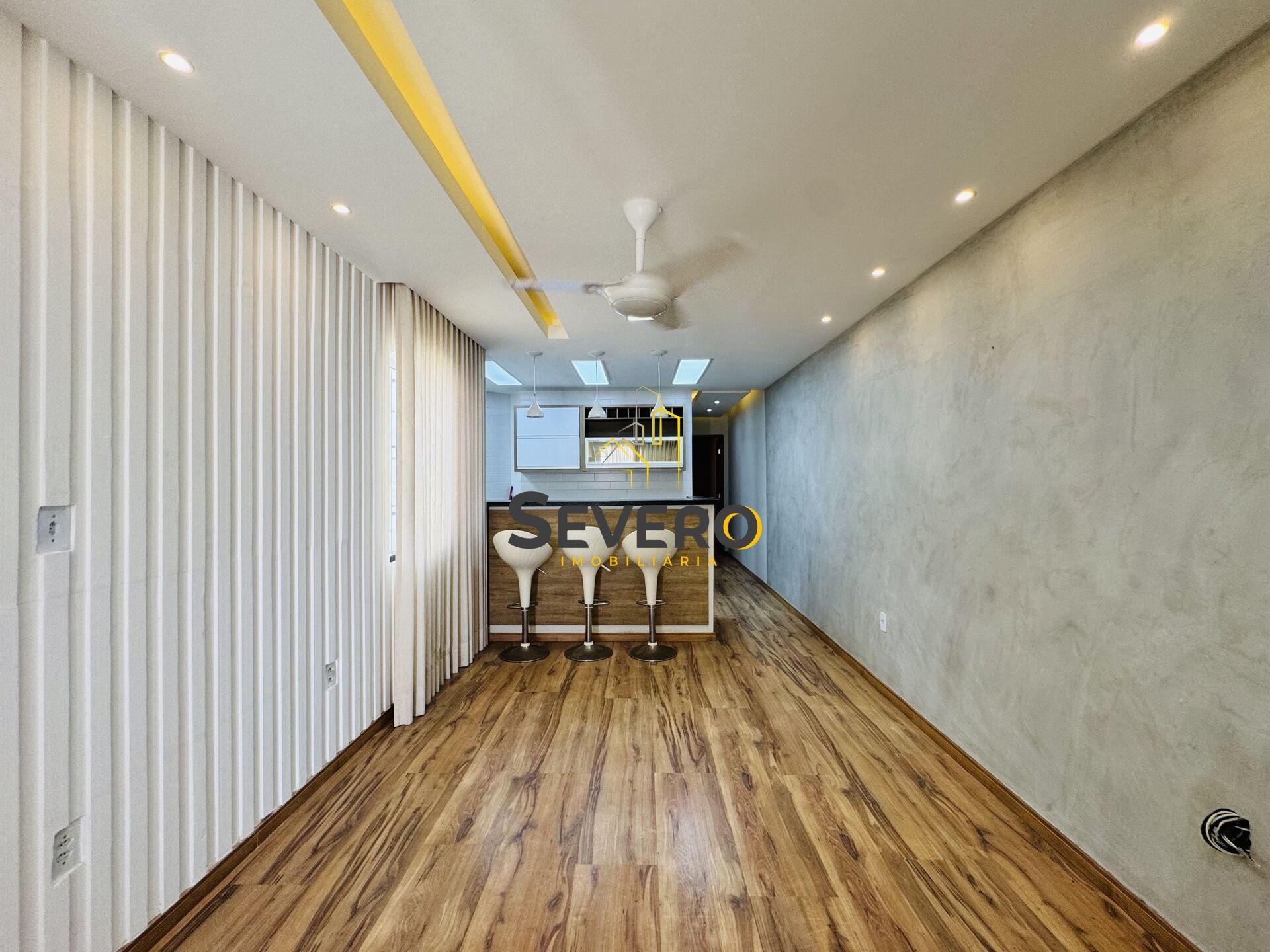 A casa possui 2 quartos (1 suíte), ambos com piso laminado, ventiladores de teto e infraestrutura pronta para ar-condicionado split. A suíte conta ainda com móveis planejados, sapateira, espaço para malas e espelho. A sala é ampla e aconchegante, com painel e estante em gesso, spots em luz âmbar, parede texturizada, cortinas sob medida e ventilador de teto.