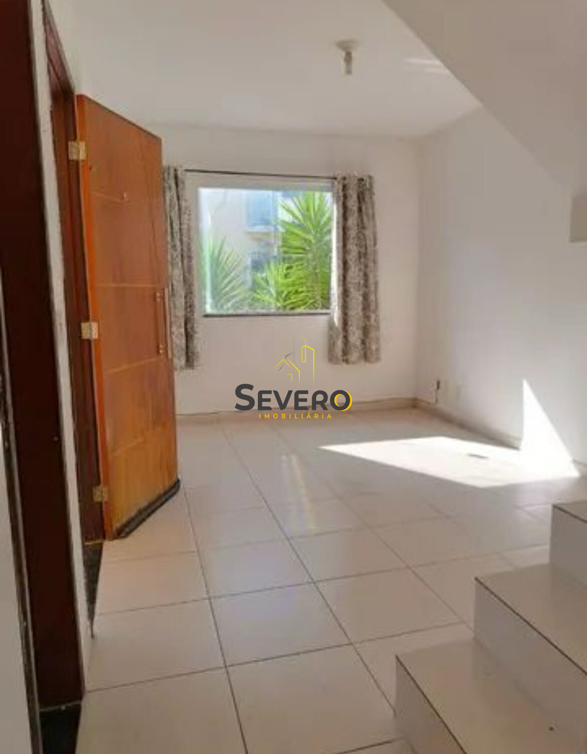 No primeiro andar nós temos a vaga de garagem coberta, sala em dois ambientes, cozinha, banheiro social e área de serviço.